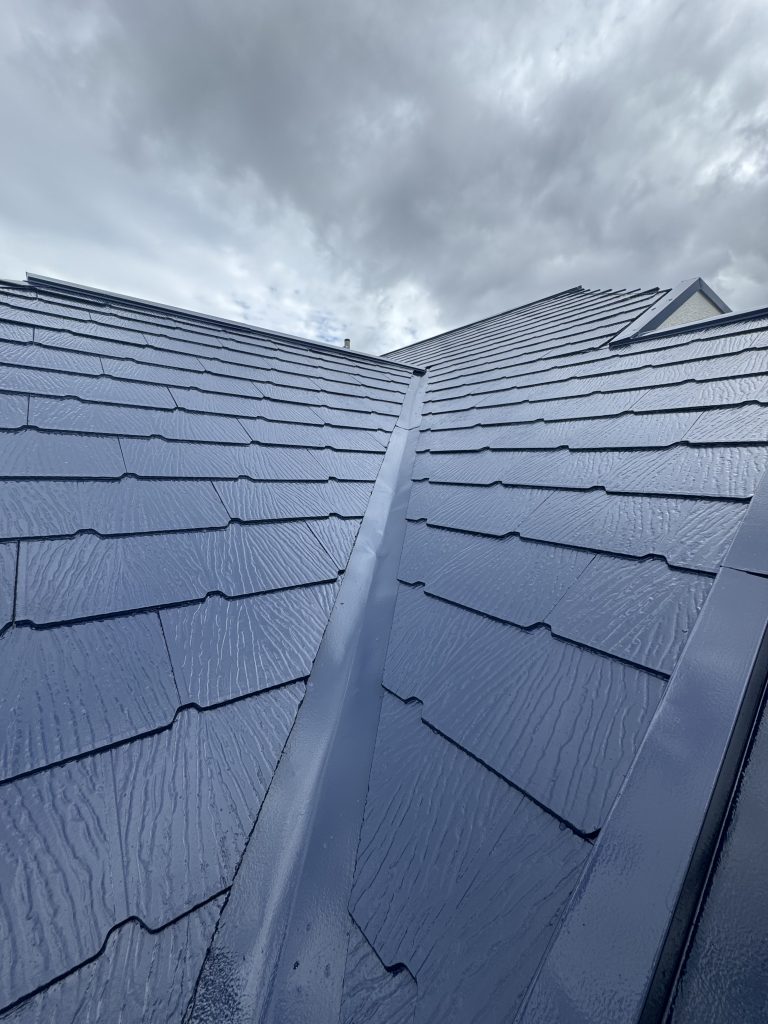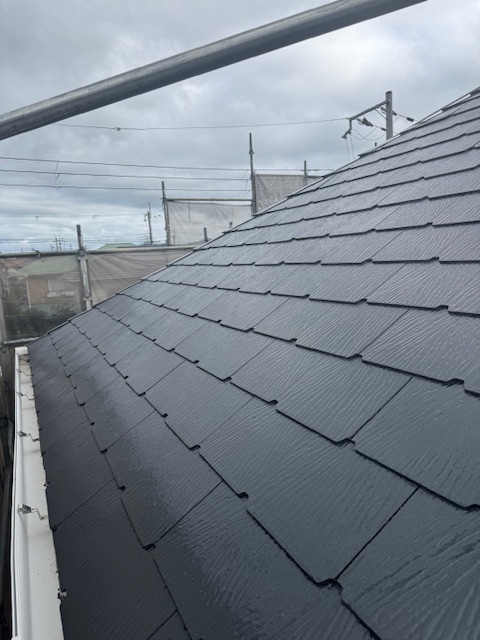 屋根塗装3回目の上塗りを行ないます。屋根の防水機能がこれで回復し綺麗になりました。