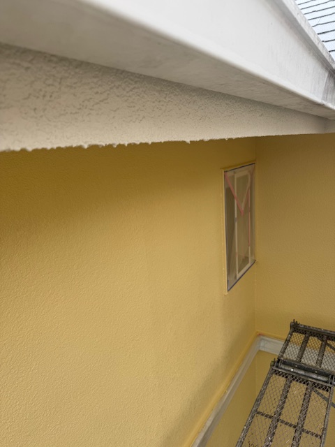 玄関上の外壁の塗膜の浮き補修を行います。今回、一番お気になされていた箇所ですのでまずは、下地のボードとボードの継ぎ目部分を補修するにあたり浮いていた塗膜をめくり継ぎ目の補修を行います。